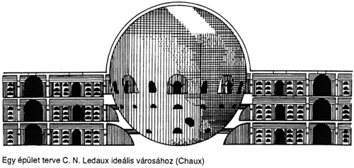 A forradalmi építészek új elveik helyességét tervek közreadásával igyekeztek népszerűsíteni. E tervek hatalmas mértani testeket ábrázoltak, kocka formájú, dísztelen házakat, hatalmas, gömb alakú lefedéseket (89. ábra), a tömör épületrészek között levegős, pillér- vagy oszlopsoros átkötéssel. A belső tereket hatalmas hengerpalást - dongaboltozat - vagy égig érő félgömb kupola fedte volna. Ablakot nem alkalmaztak, a fényt rejtett csatornákon vezették a tér belsejébe. A belsők díszét az épület használatával kapcsolatos tárgyak - könyvtár esetében például a könyvtári polcokon sorakozó könyvek - adták volna: minden más - az épület rendeltetésével kapcsolatba nem hozható - díszítést feleslegesnek tartottak és elhagytak.